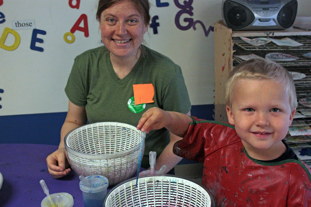 Next, we moved onto the art area. I love the art area. I am not very artsy, more crafty, but I am jealous of all those art people out there. Today's activity was spin art. I wish I had thought of doing this at home. Using salad spinners, you place a piece of paper in there and drop paint in using an eye dropper. Then spin it and vwalla!! It was fun.